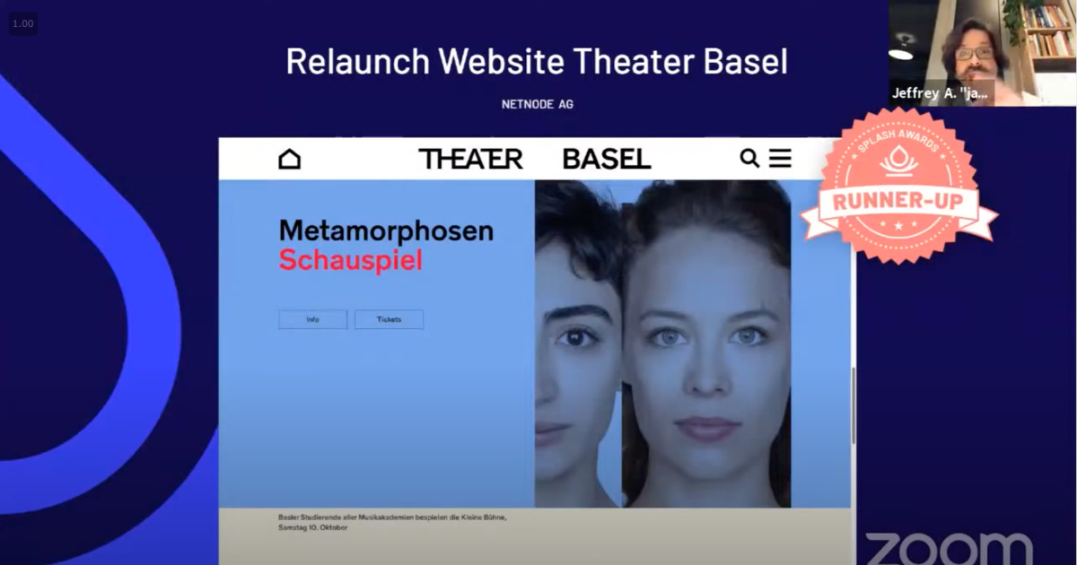 Am 27. November 2020 war es soweit. Das Redesign von theater-basel.ch mit dem Drupal Runner Up Award in der Kategorie "Public Affairs" ausgezeichnet. Die Juroren waren überzeugt von dem optisch ansprechenden Auftritt kombiniert mit einem tollen technischen Stack im Hintergrund.