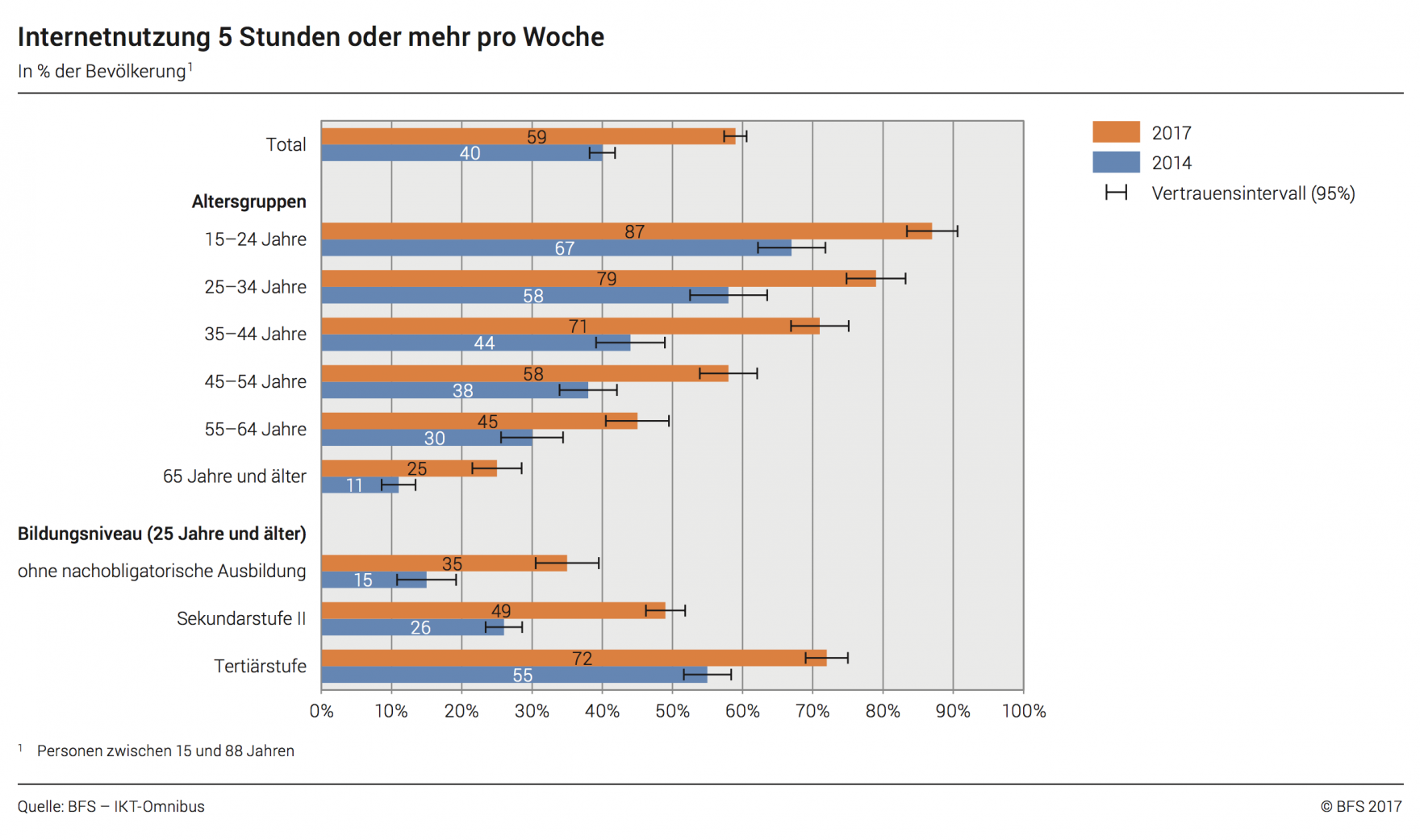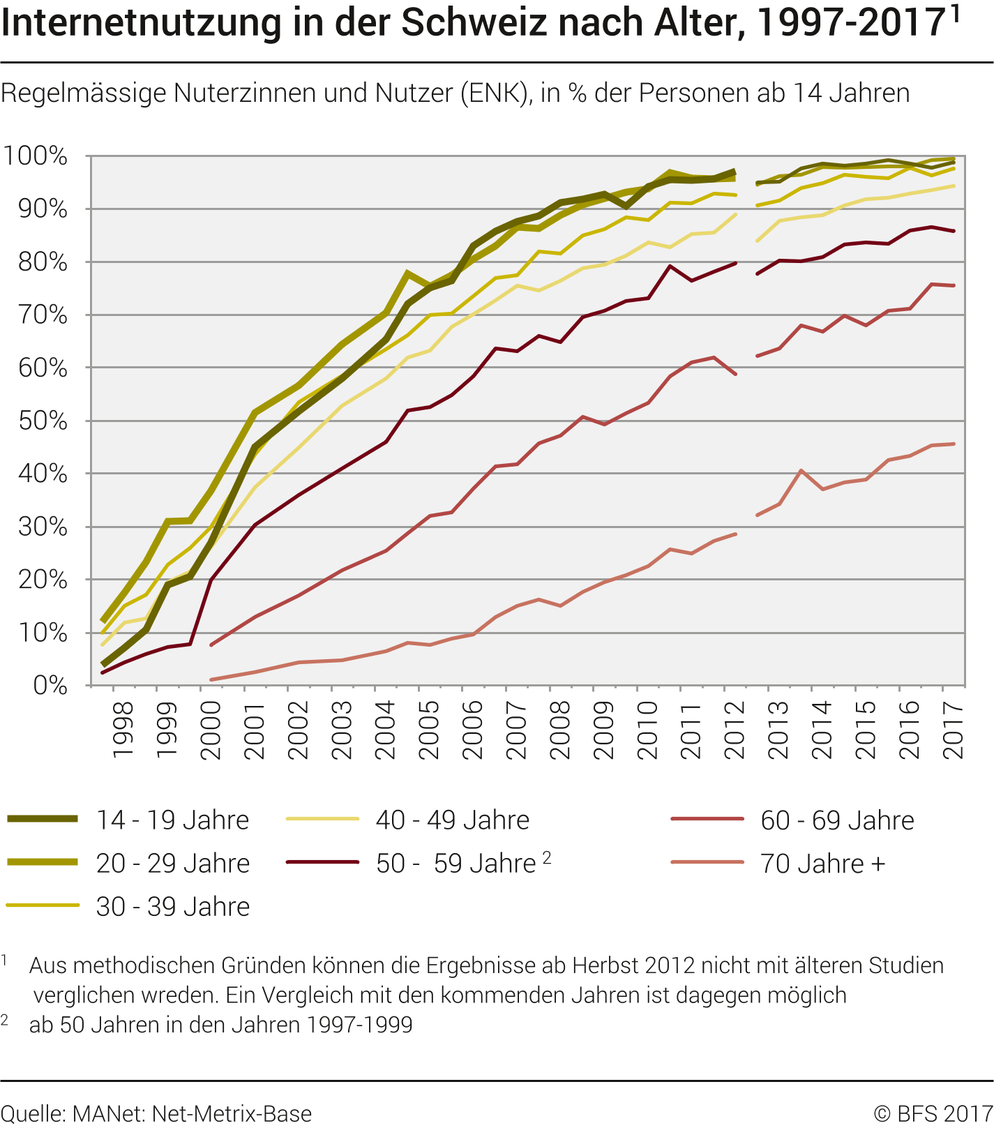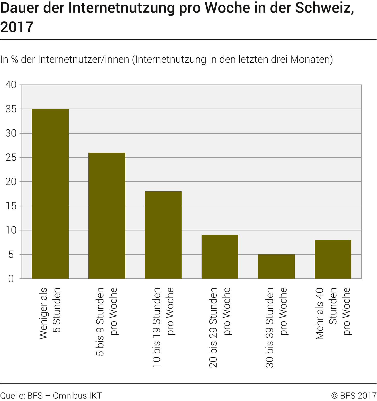 Am 20. November 2017 hat das Bundesamt für Statistik die neusten Zahlen zur Internetnutzung der Schweizer Bevölkerung veröffentlicht. Wir haben die wichtigsten Daten herausgepickt und interpretiert. Die ganze Medienmitteilung ist unter https://www.bfs.admin.ch/bfs/de/home/aktuell/neue-veroeffentlichungen.as... zu finden.