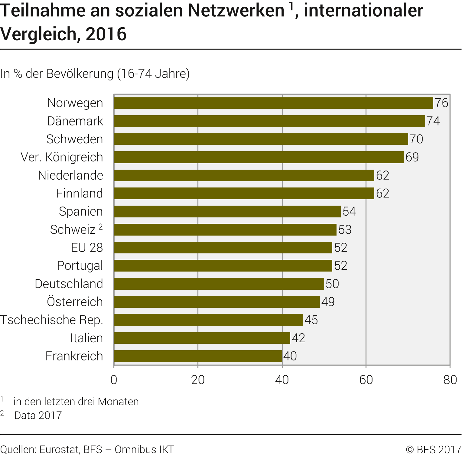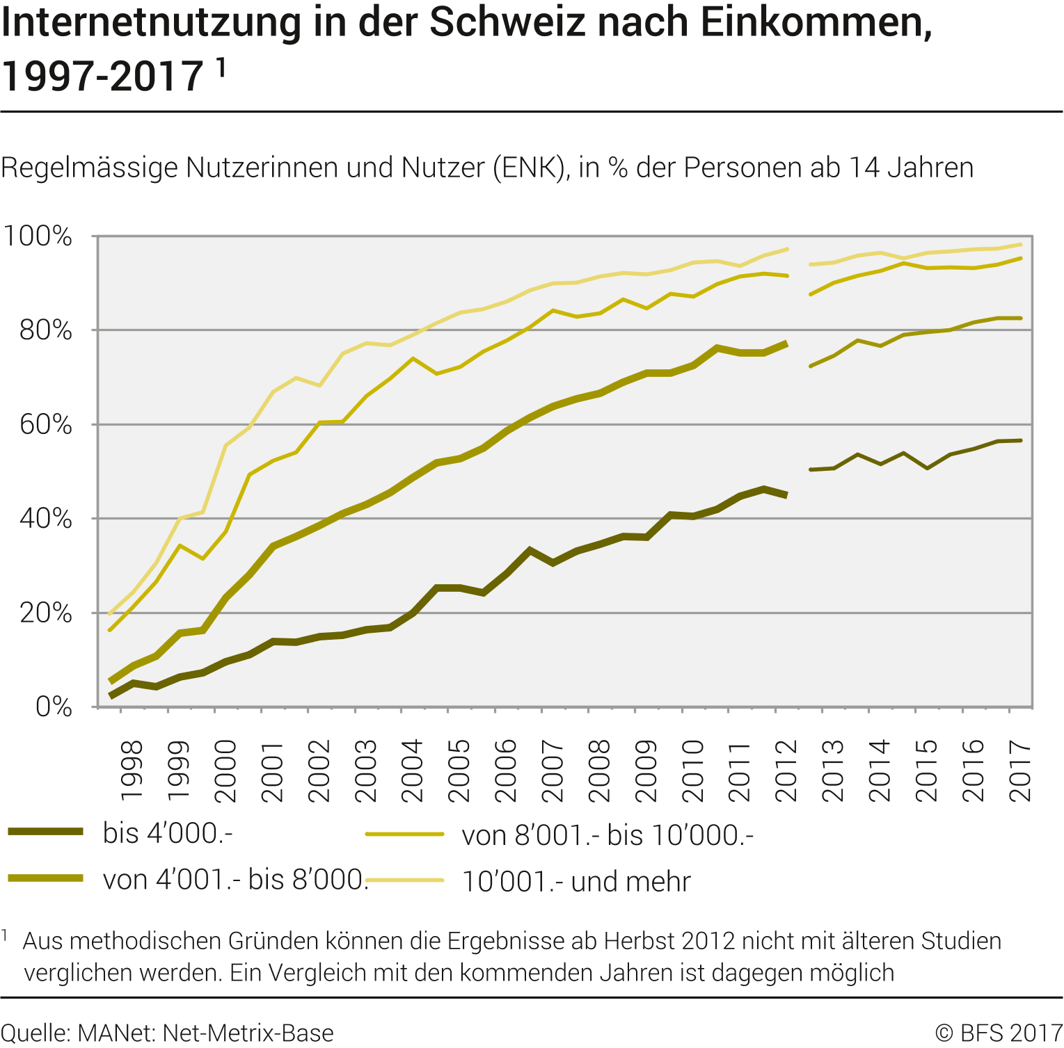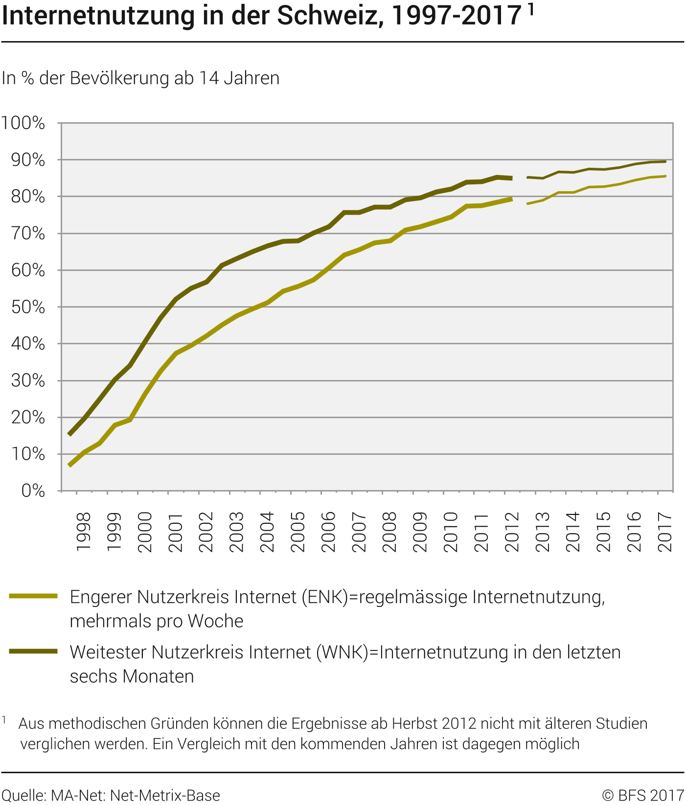 Am 20. November 2017 hat das Bundesamt für Statistik die neusten Zahlen zur Internetnutzung der Schweizer Bevölkerung veröffentlicht. Wir haben die wichtigsten Daten herausgepickt und interpretiert. Die ganze Medienmitteilung ist unter https://www.bfs.admin.ch/bfs/de/home/aktuell/neue-veroeffentlichungen.as... zu finden.