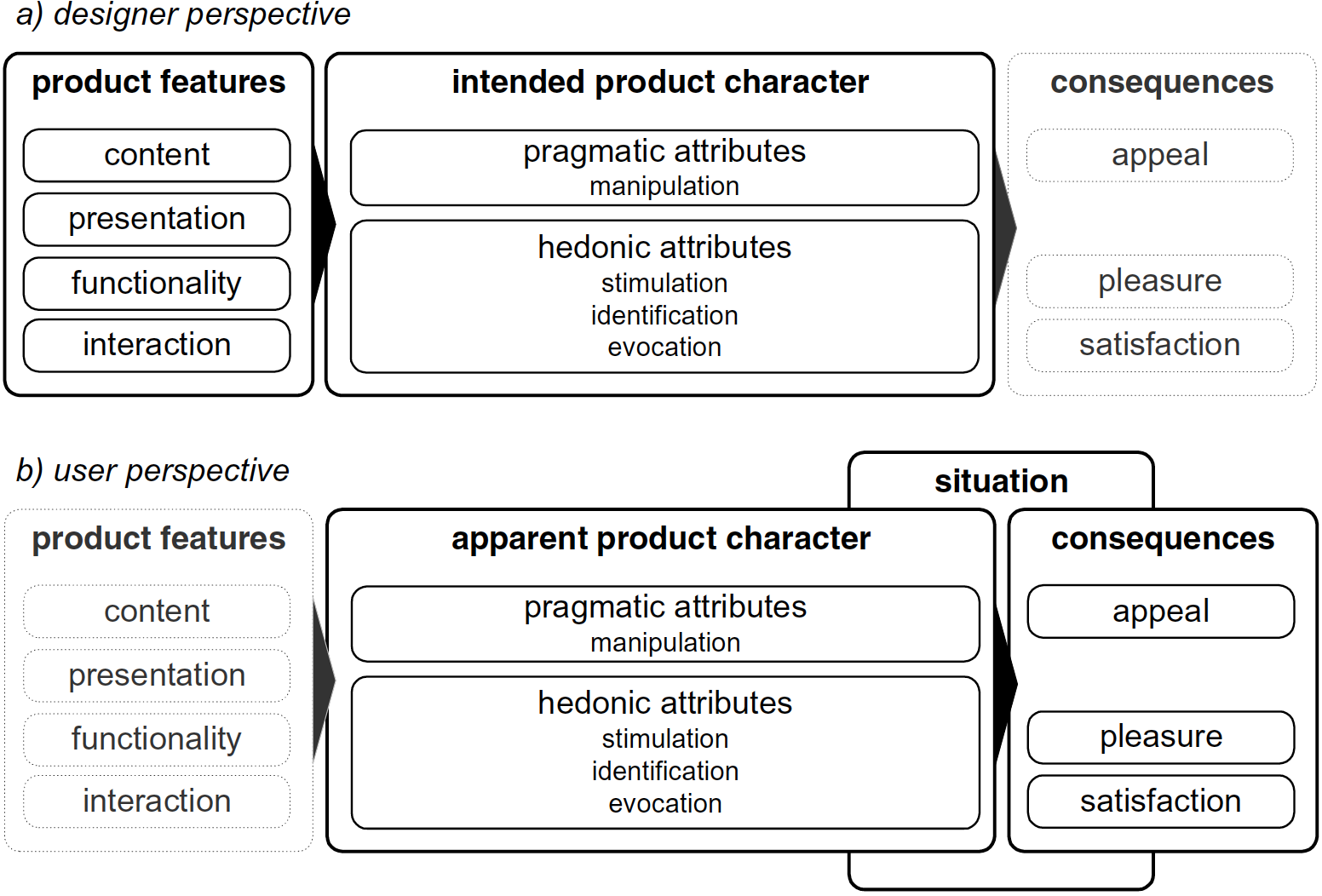 • Dieser wahrgenommene Produktcharakter führt zu den Konsequenzen: Die Beurteilung der Produktattraktivität oder Produktwirkung (Appeal) (zB es ist gut/schlecht), emotionale Konsequenzen wie Freude und Zufriedenheit, schlussendlich wird auch das Verhalten beeinflusst, zum Beispiel wie lange das Produkt benutzt wird, oder wie oft.