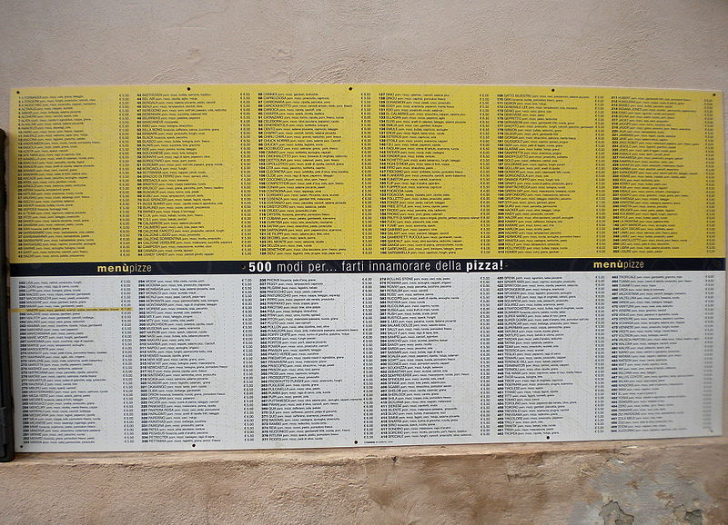 Wie soll der Restaurant-Besucher sich entscheiden können, welche der 500 Pizzen er nehmen soll? Bei jeder einzelnen Wahl wird er eine gewisse Reue haben, da eine der anderen 499 Pizzen mit Bestimmtheit die bessere Wahl gewesen wäre. Ausserdem benötigt der Besucher sehr lange, um sich mit der Auswahl auseinander zu setzen und sich zu entscheiden.