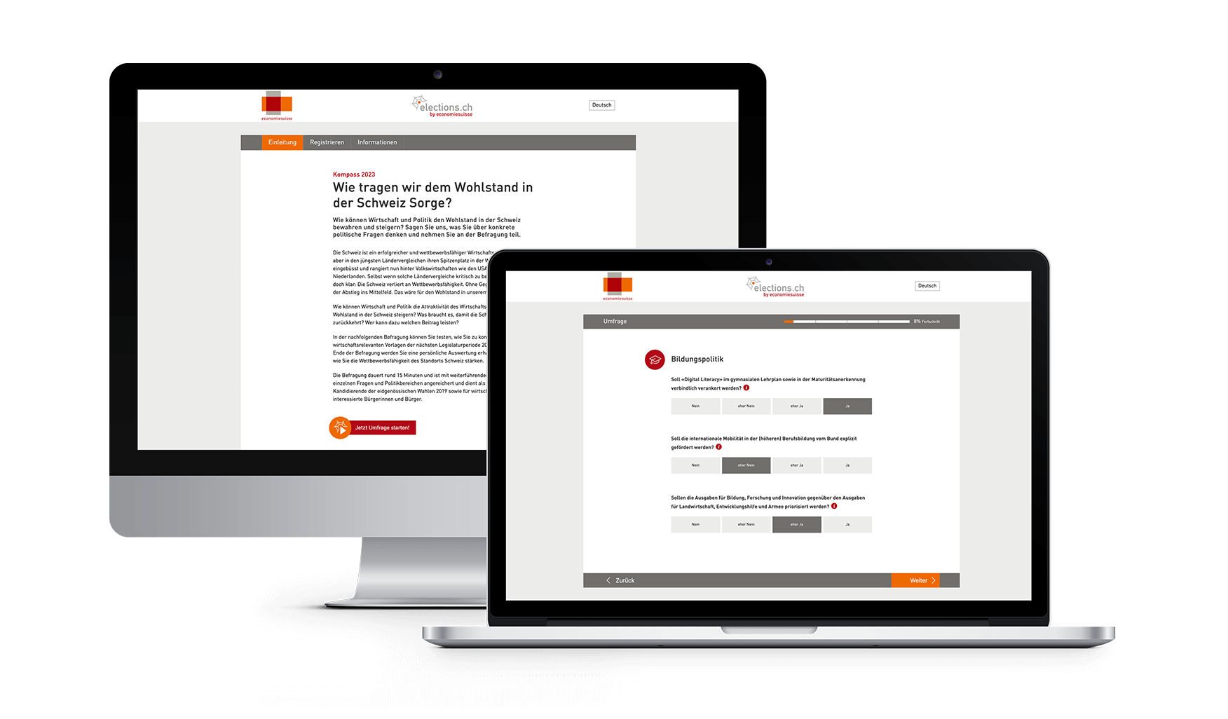Die Inhalte der Umfrage werden als JSON-Dokument eingelesen. Daraus wird Mittels der Technologie Vue.js das gesamte Frontend generiert. Diese Technologie ermöglicht fliessende Übergänge und eine sehr schnelle Interaktion mit dem Benutzer. Die gesamt Umfrage ist zudem dreisprachig. An dieser Stelle ist hervorzuheben, dass das Design ebenfalls aus dem Hause NETNODE stammt!